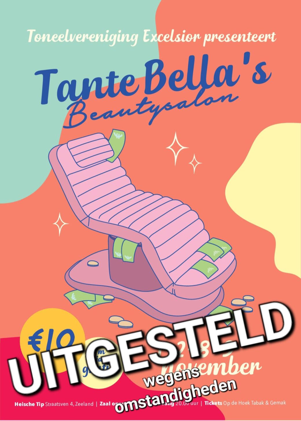 In eerdere berichten over onze voorstellingen van Tante Bella’s Beautysalon op 1-2-8 en 9 november a.s. moeten we helaas berichten dat deze wegens omstandigheden uitgesteld worden. Nader bericht volgt als er nieuwe data bekend zijn. Reeds aangekochte tickets kunnen tot eind januari ingeleverd worden bij op d´n hoek in Zeeland. U krijgt het volledige bedrag retour.